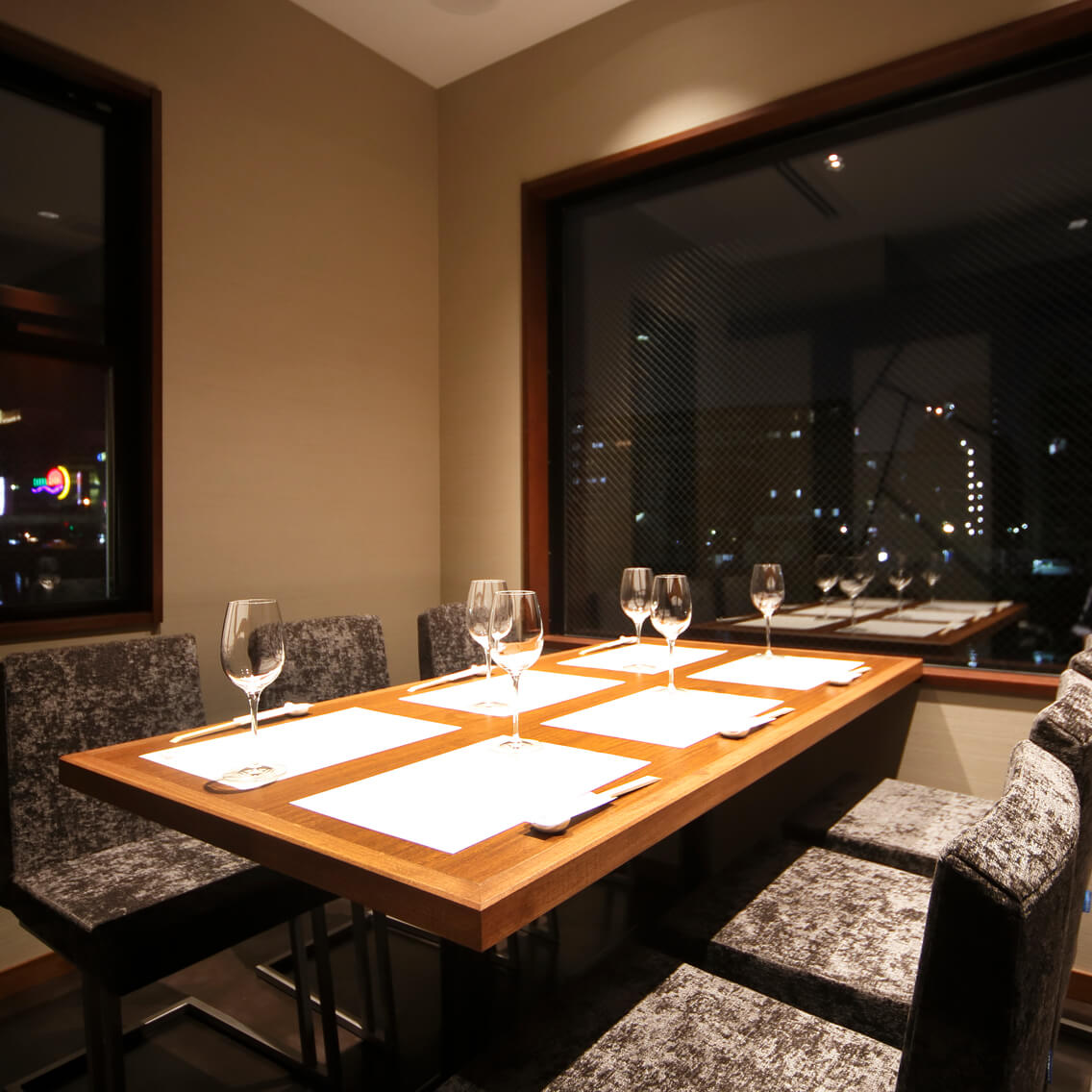 夜の那珂川を望む落ち着いた空間。
